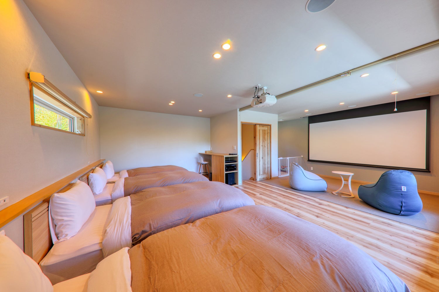 またペレットストーブなど高原滞在ならではの暖房設備も完備、揺らめく炎を眺めつつお食事も楽しんで頂けます。また皆様でお楽しみ頂けるよう2階寝室にプロジェクターシアターを設置。