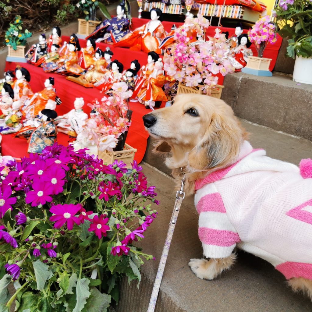 座間神社では毎年ひな祭りが開催されており、境内に続く階段にたくさんのお雛様が並びます。桃の節句を愛犬とお祝いできるのは嬉しいですね◎